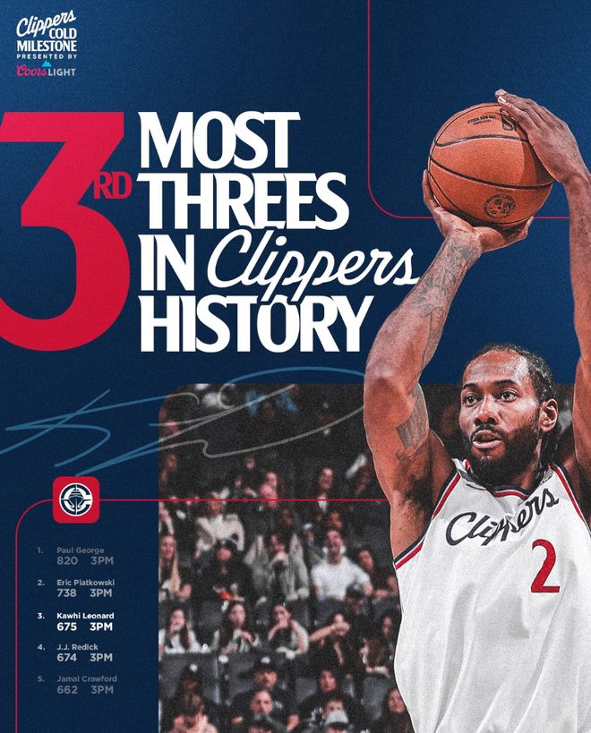 2.伦纳德完成675+三分超越雷迪克升队史第三;